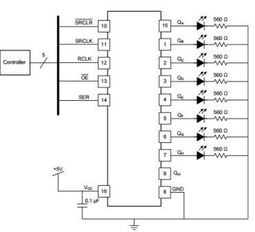 一些電機(jī)、LED和其它設(shè)備可能不會(huì)從作為處理器的內(nèi)部串行接口中受益。這些情況下,可以使用如圖3所示的SN74HC595這一串行到并行轉(zhuǎn)換器。該設(shè)備有助于將數(shù)據(jù)順序傳送到輸出。我選擇這部分用于設(shè)計(jì),因?yàn)樗子谑褂、成本低,并使設(shè)計(jì)人員能夠堆疊或菊花鏈類似設(shè)備。任何諸如SN74HC164或TCA9539在內(nèi)的其它串行到并行設(shè)備也可以幫助完成任務(wù)。