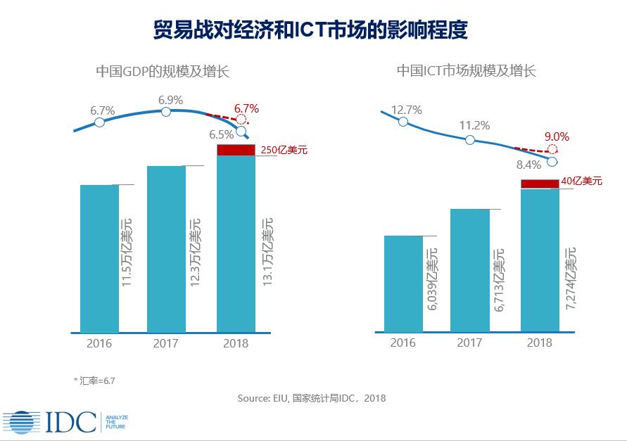貿(mào)易戰(zhàn)對中美兩國的經(jīng)濟都將有負面影響,特別是對貿(mào)易順差巨大的中國。根據(jù)IDC的研究,基于當前雙方各340億美元產(chǎn)品開始加征關(guān)稅,中國2018年GDP增長率將減少0.2%(原來的6.7% 到影響后的6.5%),影響的GDP總額約250億美元(1US$=6.7 RMB)。中國2018年總體ICT市場增長率將減少0.6%(原來9.0%到影響后的8.4%),影響的ICT市場規(guī)模約40億美元。