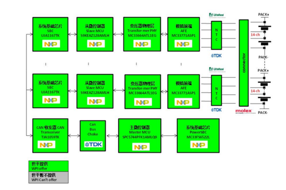 圖示1-基于NXP產(chǎn)品的BMS動(dòng)力電池管理系統(tǒng)解決方案的系統(tǒng)方案圖