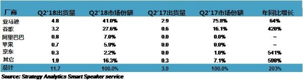 Strategy Analytics總監(jiān)David Watkins表示,“亞馬遜和谷歌全球智能音箱出貨量份額從2017年Q2的超過90%下降到2018年Q2的69%。此次下降不僅反映了智能音箱市場競爭的加劇同時(shí)也反映了亞馬遜和谷歌無法打入快速增長的中國市場——該市場由阿里巴巴,京東和百度等本土大牌主導(dǎo)。 中國有潛力成為智能音箱以及支持它們的語音助理平臺的巨大盈利市場;同時(shí),谷歌最近以5億美元投資了中國電子商務(wù)巨頭京東,并與其達(dá)成了戰(zhàn)略合作伙伴關(guān)系,這表明抓住中國市場帶來的機(jī)遇將會至關(guān)重要!