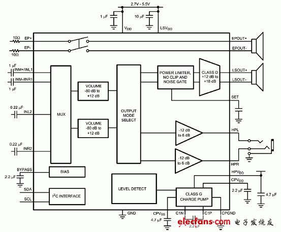 | NS 公司的LM49153是全集成音頻子系統(tǒng),包括高效25mW的G類耳機放大器(THD+N ≤ 1%)和高效的1.35W D類揚聲器放大器(RL = 8Ω, THD+N < 1%),通過I2C進行音量,模式選擇和關(guān)斷控制,主要用在手機和智能手機。本文介紹了LM49153主要指標(biāo),主要特性,典型音頻放大器應(yīng)用電路以及演示板電路圖和材料清單,元件布局圖。