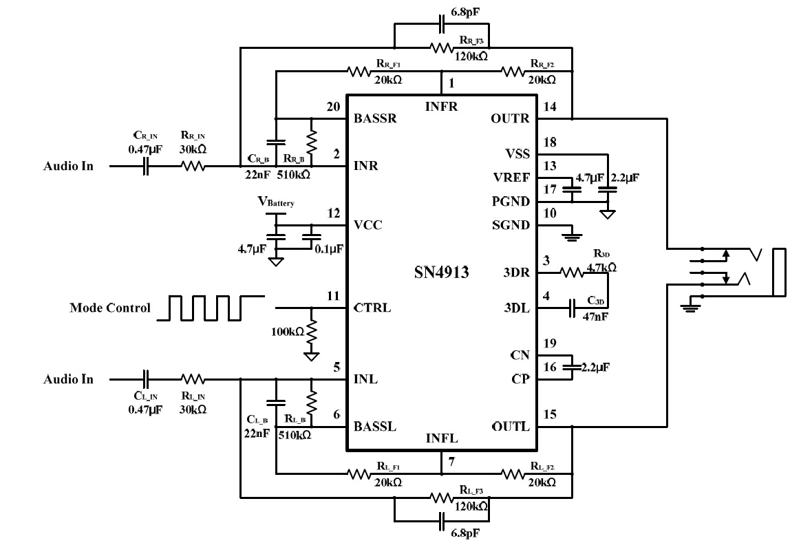 SN4913通過一線脈沖的方式來實現(xiàn)4種工作模式?使用外部電阻來對增益進(jìn)行調(diào)節(jié),集成Pop-and-Click抑制電路,過熱保護(hù)功能。