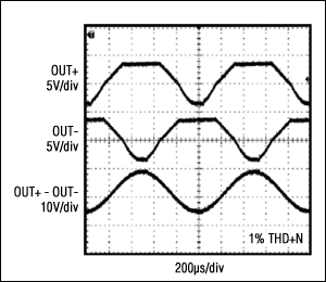 MAX9730和MAX9788可以確保在兩個(gè)電源之間切換不會(huì)產(chǎn)生音頻雜音。當(dāng)輸出信號(hào)達(dá)到VCC和GND供電所允許的極限時(shí),負(fù)電源被自動(dòng)連接至輸出級(jí)。這樣,輸出信號(hào)不會(huì)在負(fù)擺幅側(cè)出現(xiàn)削頂,但仍會(huì)鉗位其正擺幅。為了校正這一點(diǎn),放大器給負(fù)極性輸出增加額外的校正信號(hào),如圖2所示。分別觀察正、負(fù)輸出時(shí),正半周波形被明顯削頂,而負(fù)半周存在明顯失真。盡管這些信號(hào)出現(xiàn)了嚴(yán)重的失真,但卻被嚴(yán)格控制,充分利用了該架構(gòu)的優(yōu)勢(shì)。施加到負(fù)載上的實(shí)際輸出信號(hào)沒(méi)有失真。