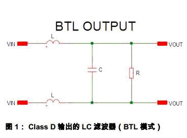 圖1是一個典型的Class D 輸出濾波網(wǎng)絡(BTL 輸出模式)。LC 濾波器由L,C 和負載R 組成。