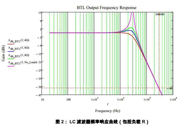 該例子中L=15uH,C=1uF,截止頻率Fn約為29kHz,在Class D 的開關頻率(約300kHz)位置提供-40dB 的衰減。在截止頻率處,不同的負載阻抗呈現(xiàn)出不同的增益。理論上空載極端情況下增益為無限大,LC 進入諧振狀態(tài)。