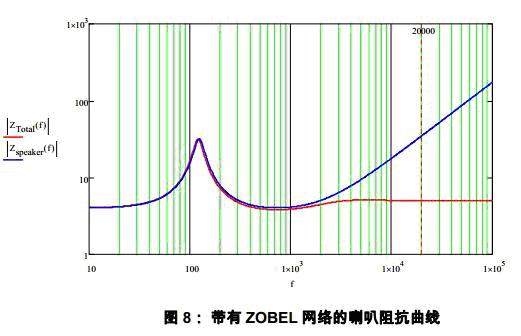 實際喇叭的高頻阻抗因為線圈電感而呈現(xiàn)隨頻率增高而上升的趨勢,由此導致了LC濾波網(wǎng)絡的高Q值。ZOBEL是和喇叭并聯(lián)的阻容網(wǎng)絡,它可以用來補償喇叭的感性而抑制喇叭阻抗的抬升。如圖7所示,ZOBEL網(wǎng)絡有電阻和電容組成。計算公式為(參見引用3):