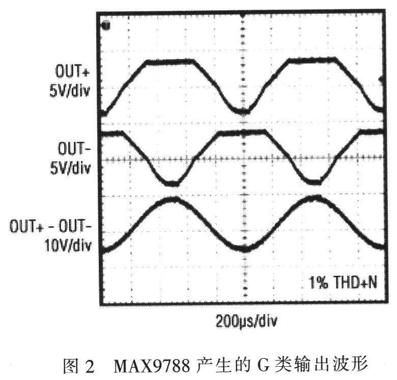 MAX9730和MAX9788可以確保在兩電源之間切換不會(huì)產(chǎn)生音頻雜音。當(dāng)輸出信號(hào)達(dá)到VCC和GND供電所允許的極限時(shí),負(fù)電源被自動(dòng)連接至輸出級(jí)。這樣,輸出信號(hào)不會(huì)在負(fù)擺幅側(cè)出現(xiàn)削頂,仍箝位于其正擺幅。為了校正這一點(diǎn),放大器給負(fù)極性輸出增加額外的校正信號(hào),如圖2所示。分別觀察正、負(fù)輸出時(shí),正半周波形被明顯削頂,而負(fù)半周存在明顯失真。盡管這些信號(hào)出現(xiàn)了嚴(yán)重的失真,但卻被嚴(yán)格控制,充分利用了該架構(gòu)的優(yōu)勢(shì)。施加到負(fù)載上的實(shí)際輸出信號(hào)沒(méi)有失真。