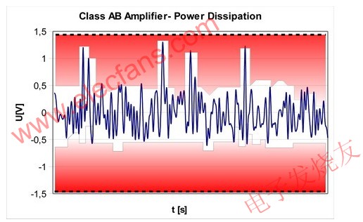 上述音頻放大器的功率數(shù)值為峰值功率值。實際上,需要這個最大電源電壓的時間極短;音頻信號具有很寬的動態(tài)范圍。大部分的時間,輸出電壓均低于0.5V,而放大器的電源電壓卻可達到1.5V。輸出電壓和電源電壓之間的差異來自內(nèi)部放大器晶體管所消耗的部分,這是電力損耗的主要原因。