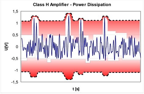 但是,這并不能掩蓋除了在高輸出電壓水平以外,晶體管仍然會消耗大量電能的事實。要解決這個問題,需要改變放大器本身的電源配置,這就是開發(fā)G類和H類放大器的原因。