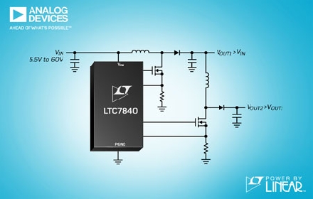 | LTC7840 60V、雙路、兩相升壓控制器能夠級聯(lián)輸出以調(diào)節(jié)超過200V電壓 |