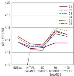 電池組 1 經(jīng)過了 100 個(gè)充電 / 放電周期,圖 3 顯示若干周期后記錄 6 節(jié)電池的電壓。該圖顯示,經(jīng)過短暫停頓后,在一個(gè)完整的充電周期結(jié)束時(shí)所測得的電池電壓。充電后,電池電壓之間的不平衡與容量和內(nèi)部電阻的小量變化有關(guān)。在第一個(gè)完整的周期中,測得的電池組容量為 2.072AHr,經(jīng)過 100 個(gè)周期后,所測得的容量為 2.043AHr,隨著周期數(shù)增加,容量有少量下降。還有一種趨勢,即隨著充電 / 放電周期數(shù)的增加,充電后電池的最終電壓下降了,100 個(gè)周期以后,這種趨勢尤其顯著。這種趨勢最有可能是因?yàn)殡姵乩匣痣姵貎?nèi)部電阻的小量增加導(dǎo)致的。內(nèi)部電阻增加使電池更快地達(dá)到充電結(jié)束門限。盡管在工作時(shí)沒有平衡,這個(gè)電池組在 100 個(gè)周期中自始至終保持著同樣程度的不平衡。能像這個(gè)電池組一樣,每節(jié)電池自然而然相互匹配的電池組相當(dāng)罕見。