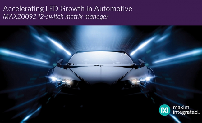 Maxim Integrated Products, Inc (NASDAQ: MXIM)宣布推出MAX20092 12通道開關(guān)矩陣管理器,使得高性能LED陣列車燈和自適應(yīng)光束調(diào)節(jié)設(shè)計(jì)能夠滿足更高電流的設(shè)備需求,同時(shí)降低方案尺寸、提高靈活性。通過最低導(dǎo)通電阻(RDS_ON)的內(nèi)部開關(guān),該IC可最大程度減少LED陣列照明的發(fā)熱,相比最接近的競(jìng)爭(zhēng)方案降低65%。