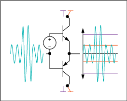 圖3. AB類放大器將兩個(gè)晶體管偏置,使其在信號(hào)接近零時(shí)能夠?qū)。所以這類放大器的效率比A類放大器高,失真比B類放大器小。