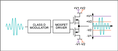 圖6. DG類放大器檢測(cè)輸出信號(hào)的幅值,然后根據(jù)需要切換電源軌,以更高的效率提供需要的功率。