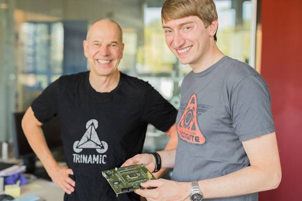 TRINAMIC首席執(zhí)行官M(fèi)ichael Randt和 Onno Martens博士展示全球首款RISC-V電機(jī)驅(qū)動(dòng)器芯片