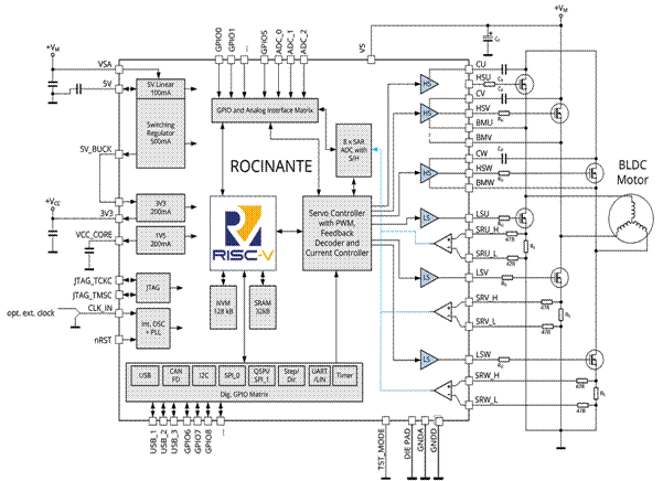 該組件也是世界上第一個(gè)在單一RISC-V中實(shí)現(xiàn)高壓技術(shù)的產(chǎn)品,可以實(shí)現(xiàn)能夠直接驅(qū)動(dòng)N溝道的MOSFETs進(jìn)而控制BLDC, 步進(jìn)電機(jī), 直流有刷電機(jī)以及音圈電機(jī)。