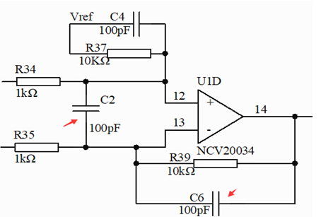 運(yùn)放芯片本身對共模干擾有抵抗作用,而在差模干擾的抵抗作用稍弱,所以設(shè)計的時候要著重提高差分線上的差?垢蓴_能力。如圖2所示,C2電容就是為了提高抗差模干擾能力。差分線上的電阻(R34、R35)和反饋電阻(R39)應(yīng)使用高精度的電阻,使得理論計算得到的參數(shù)是準(zhǔn)確可靠的。然后與運(yùn)放的輸出連接的AD口引腳上并連一個RC電路濾掉高次諧波干擾和隨機(jī)脈沖干擾,從而提升抗干擾能力。
