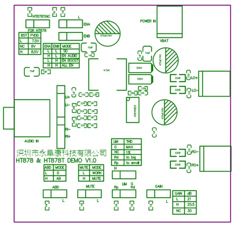 由此,深圳市永阜康科技有限公司推出單節(jié)鋰電池內(nèi)置自適應(yīng)升壓AB/D類切換8W雙聲道音頻功放IC-HT878/HT878T,突破了單節(jié)鋰電池供電的局限性,為用戶提供極致的功率輸出,自帶的AB/D類切換功能完美的解決FM收音干擾,其優(yōu)異的性能堪稱現(xiàn)階段單節(jié)鋰電內(nèi)置升壓雙聲道音頻功放的巔峰之作。