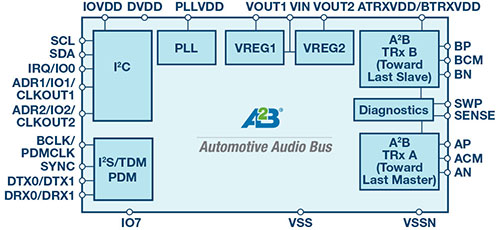 •最重要的是,對于特定的應(yīng)用場景,A2B技術(shù)可提供小功率的供電,將不超過300 mA的電流傳輸至A2B菊花鏈上的音頻節(jié)點。有了這個小功率供電傳輸,便無需在音頻ECU上使用本地電源,從而進(jìn)一步降低系統(tǒng)成本。