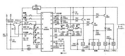 3.音量遙控:圖2b中IC2第20、11腳為獨立的兩個雙穩(wěn)態(tài)輸出端,調(diào)音量大小時如按一下音量+鍵,IC2第20腳輸出低電平,使V8、VD3截止,LED8點亮作顯示,并使V6導(dǎo)通。電源V+經(jīng)V6、音量電機M和V9到電源V-,實現(xiàn)音量增加。如按一下音量-鍵,則IC2第11腳為低電平,使V9、VD4截止,LED9點亮作顯示,并使V7導(dǎo)通。電源V+經(jīng)V7、音量電機和V8到電源V-。使電機反轉(zhuǎn)達到音量減小目的。
