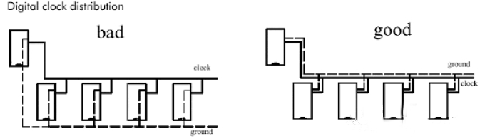 對(duì)應(yīng)地線回路規(guī)則,實(shí)際上也是為了盡量減小信號(hào)的回路面積,多見于一些比較重要的信號(hào),如時(shí)鐘信號(hào),同步信號(hào);對(duì)一些特別重要,頻率特別高的信號(hào),應(yīng)該考慮采用銅軸電纜屏蔽結(jié)構(gòu)設(shè)計(jì),即將所布的線上下左右用地線隔離,而且還要考慮好如何有效的讓屏蔽地與實(shí)際地平面有效結(jié)合。