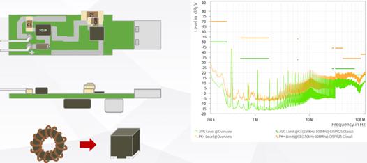 環(huán)形電感的漏磁較大,體積也比較大,對大地也有比較大的耦合電容,因此其對外的輻射更大,如圖8所示將環(huán)形電感替換為貼片電感后整體的EMI就會下降很多。