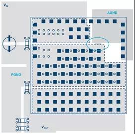 圖2.分開的AGND和PGND在接地標(biāo)簽下方利用過(guò)孔連接。