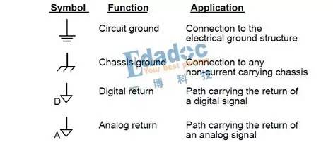 回到EMC培訓,Mark的觀點其實很清楚了,那就是地在PCB里是不存在的,它只是0v參考的符號象征。除非我們的設計或應用在操作上需要區(qū)分數(shù)字和模擬電路,且需要將兩者彼此分割,或者需要從0v參考地區(qū)分不同的功能區(qū)域如機殼和ESD地,而且就算在同一系統(tǒng)里使用不同的地,在系統(tǒng)的某個地方也需要將這幾種不同的地連接起來,并且需要EMC工程師來保障相關的連接是否可行。除此之外其他的設計都建議大家使用一個地的符號來表示0v參考。下圖是幾個常見地的表示符號及功能應用解釋,注意數(shù)字和模擬地用的是回流來形容而不是地。