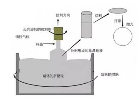 為了形成單晶硅,還需要控制晶體的方向,坩堝帶著多晶硅熔化物在旋轉(zhuǎn),把一顆籽晶浸入其中,并且由拉制棒帶著籽晶作反方向旋轉(zhuǎn),同時慢慢地、垂直地由硅熔化物中向上拉出。