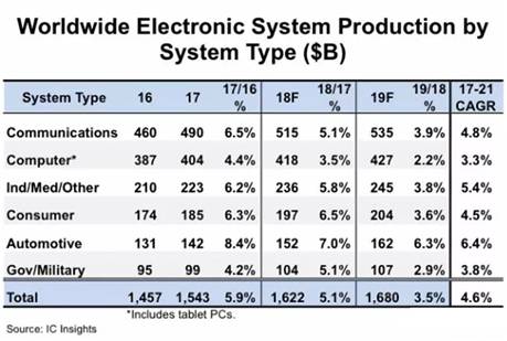 IC Insights市場分析師指出,今年汽車電子系統(tǒng)的銷售額預(yù)計(jì)將成長7%,達(dá)到1,520億美元,2019年將再成長6.3%,達(dá)到1,620億美元。該公司預(yù)計(jì),從2017年到2021年,汽車電子系統(tǒng)銷售將以6.4%的復(fù)合年成長率(CAGR)成長,成長幅度超過其他的主要電子系統(tǒng)類別。