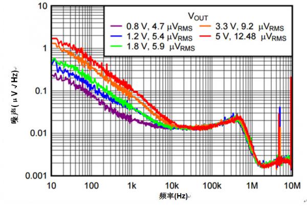 如您從各種曲線看到的那樣,輸出噪聲(以每平方根赫茲[μV/ Hz]來表示)集中在頻譜低端。該噪聲大部分出自內(nèi)部參考電壓,以及誤差放大器FET和電阻分壓器。