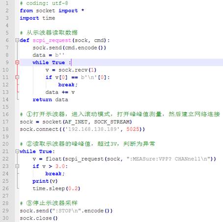 任何東西有利必有弊,滾動(dòng)模式當(dāng)然也有,它的缺點(diǎn):不支持觸發(fā)及觸發(fā)后自動(dòng)停止。也就是用滾動(dòng)來分析問題時(shí),需要用人眼去判定異常,并且在抓到異常后,手動(dòng)停止采樣,這有時(shí)是很困難的。這里推薦一種在線監(jiān)測異常的方法,首先開啟ZDS4000的滾動(dòng)測量功能,其次然后通過網(wǎng)絡(luò)來讀取測量值,判斷是否有異常,最后停止示波器采樣。還是以電壓跌落為例(出問題時(shí)峰峰值為5V),示波器的設(shè)置及python監(jiān)控腳本如下: