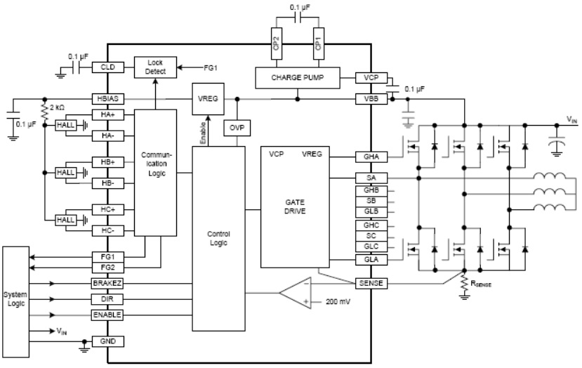 通過使用外置MOSFET,可對輸出電流進行升級?赏ㄟ^CLD終端上的外置電容器設定鎖定轉(zhuǎn)子檢測時延?墒褂脝⒂、方向和制動輸入控制電動機速度、位置和轉(zhuǎn)矩?赏ㄟ^FG1輸出(使用所有三個霍爾元件轉(zhuǎn)換)或FG2(使用霍爾元件A轉(zhuǎn)換)對輸出速度進行調(diào)節(jié)。
