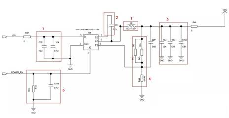 圖中分為6個部分,按照序號,分別為:輸入電容,自舉電容,電感,反饋電阻,輸出電容,緩啟動。