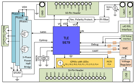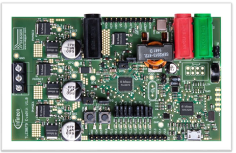 This board is intended to provide a simple, easy-to-use tool for getting familiar with Infineon’s embedded power IC TLE9879. It contains the TLE9879 and its typical application circuit including three MOSFET half bridges to instantly drive a BLDC motor. The board is ready to connect with car supply or similar and has an implemented Segger for debugging on board.