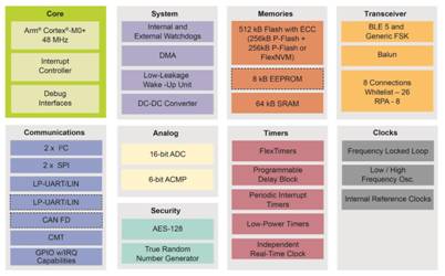 KW36是NXP的一款車規(guī)級低功耗藍(lán)牙Soc,由ZLG代理銷售。KW36其擁有CAN-FD和LIN外設(shè),適合于各種車載物聯(lián)網(wǎng)應(yīng)用,如圖5 其高配的外設(shè)和內(nèi)存更為KW36添磚加瓦,使其在車載物聯(lián)網(wǎng)中如魚得水。