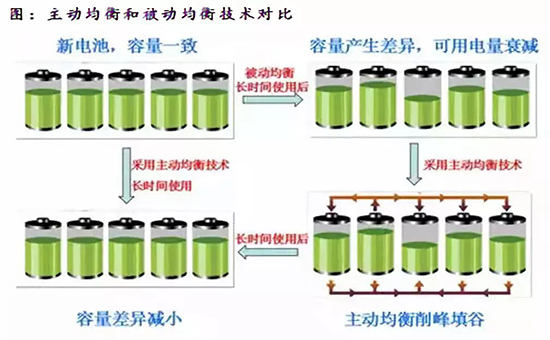 主動(dòng)均衡充電時(shí)將多余電量轉(zhuǎn)移至高容量電芯,放電時(shí)將多余電量轉(zhuǎn)移至低容量電芯,可提高使用效率,但是成本更高,電路復(fù)雜,可靠性低。未來(lái)隨著電芯的一致性的提高,對(duì)被動(dòng)均衡的需求可能會(huì)降低。
