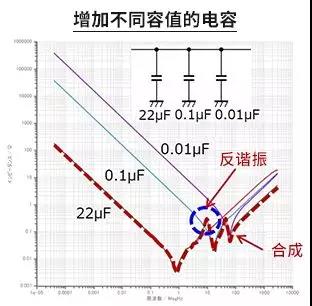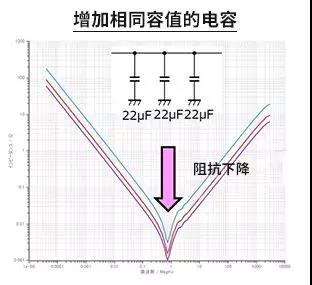 并聯(lián)的電容容值是相加的,所以3個電容為66µF,容性區(qū)域的阻抗下降。