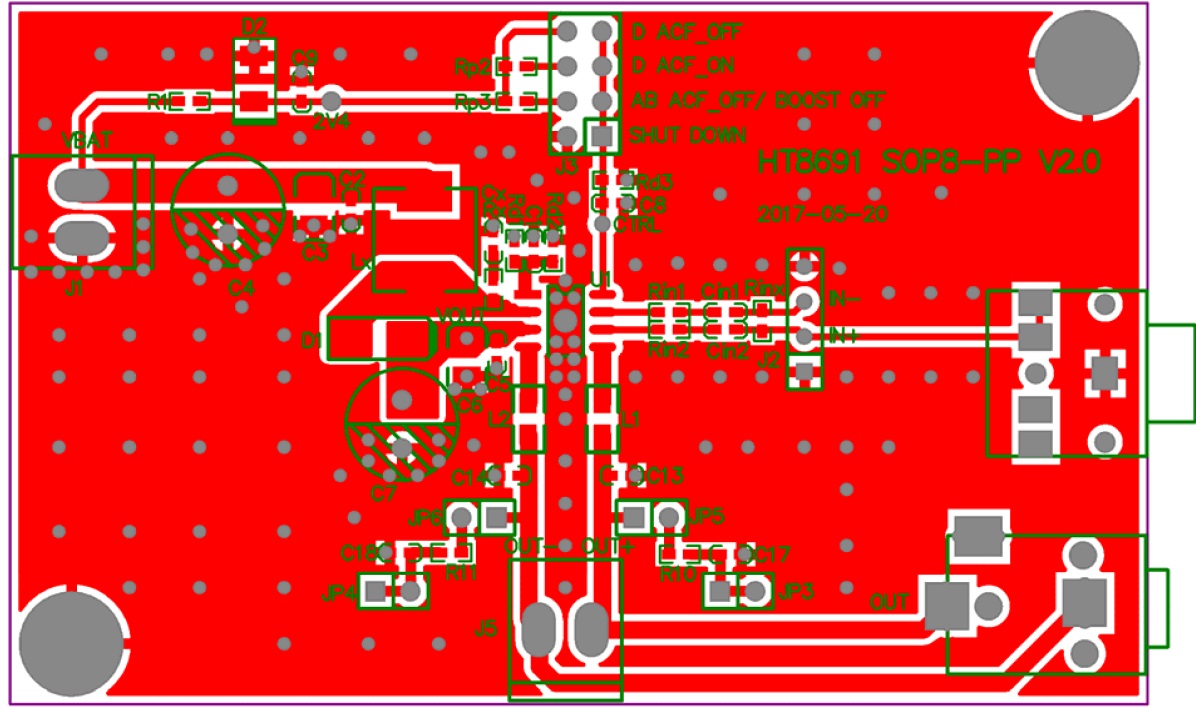 HT8691R的最大特點是防削頂失真(ACF)輸出控制功能,可檢測并抑制由于輸入音樂、語音信號幅度過大所引起的輸出信號削頂失真(破音),也能自適應地防止在BOOST升壓電壓下降所造成的輸出削頂,顯著提高音質(zhì),創(chuàng)造非常舒適的聽音享受,并保護揚聲器免受過載損壞。同時芯片具有ACF-Off 模式。