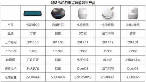 2016年10月,叮咚發(fā)布靈動版A3和悅動版Q3,其中Q3內(nèi)置2200mAH電池,可連續(xù)播放8小時,同時搭配Flash charging快充技術(shù)。2017年,帶電池的便攜音箱逐漸增多,包括若琪的月石、DOSS的小度音箱、出門問問的小問音箱等。進(jìn)入2018年,蘇寧發(fā)布小Biu智能音箱,搭載DuerOS2.0,配備3000mAh大容量鋰電池,在沒有電源的情況下可連續(xù)工作6小時。