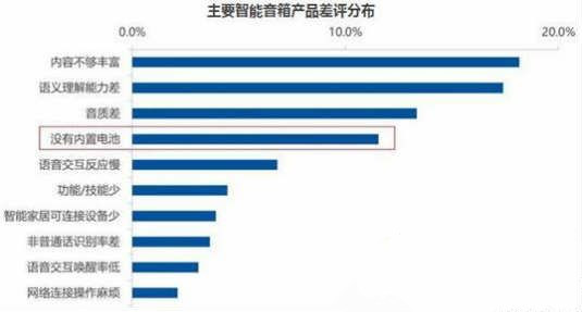 根據(jù)奧維云網(wǎng)(AVC)挖掘的主流電商平臺重點(diǎn)智能音箱品牌的消費(fèi)者評價數(shù)據(jù)顯示,不帶電池的差評占比達(dá)到11.6%,排在第四位。沒有內(nèi)置電池,意味著只能插電使用,不能自由移動及隨身攜帶,使用場景大大受到限制。從機(jī)型看,小巧的機(jī)型在沒有電池方面的差評要高于其他機(jī)型。