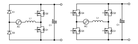 已經(jīng)采用線路同步MOSFET代替橋式二極管的方案,這種方案比較昂貴,并且需要專用的自供電控制器。業(yè)界已經(jīng)認(rèn)識到一種更好的解決方案是將主開關(guān)也用作同步整流器,其中器件溝道被配置為僅從源極到漏極導(dǎo)通,這就是所謂“無橋圖騰柱”配置。如圖3(左)所示,通過重新排列組件能夠?qū)崿F(xiàn)這種配置。D5用類似Q1的開關(guān)代替,現(xiàn)在Q1和Q2用作升壓開關(guān),同步整流器通過交流電源極性而實現(xiàn)交換功能。在這種配置中,只有一個二極管和開關(guān)的RDS(on)形成電流串聯(lián),從而顯著降低了傳導(dǎo)損耗。