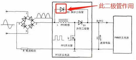 說法一:減少浪涌電壓對(duì)電容的沖擊在開機(jī)瞬間限制PFC電感L因浪涌電流產(chǎn)生巨大的自感電勢(shì),從而造成電路故障。每次電源開關(guān)接通瞬間加到電感上的可以是交流正弦波的任意瞬時(shí)值,如果在電源開關(guān)接通的瞬間是在正弦波的最大值峰點(diǎn)附近,那么給電感所加的是一個(gè)突變的電壓,會(huì)引起電感L上產(chǎn)生極大的自感電勢(shì),該電勢(shì)是所加電壓的兩倍以上,并形成較大的電流對(duì)后面的電容充電,輕則引起輸入電路的保險(xiǎn)絲熔斷,重則引起濾波電容及斬波開關(guān)管Q擊穿。設(shè)置保護(hù)二極管D2后在接通電源的瞬間,由D2導(dǎo)通并對(duì)C充電,使流過PFC電感L的電流大大減小,產(chǎn)生的自感電勢(shì)也要小得多,對(duì)濾波電容和開關(guān)管的危害及保險(xiǎn)絲的熔斷可能要小得多。