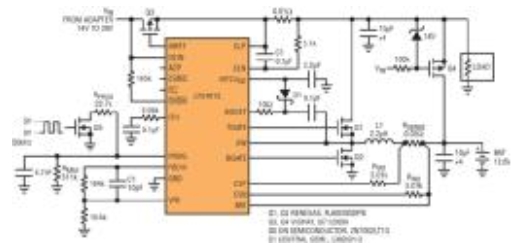 圖1中的解決方案包括LTC4012電池充電器以及由MOSFETS Q1、Q2、電感器L1和輸入輸出濾波電容組成的功率鏈路。在電源故障或掉電的情況下,MOSFET Q3將充電器與輸入線路斷開,MOSFET Q4則將電池連接到負(fù)載。通過低功耗MOSFET Q5的柵極提供的控制脈沖信號占空比,調(diào)制流至電池BAT的充電電流。