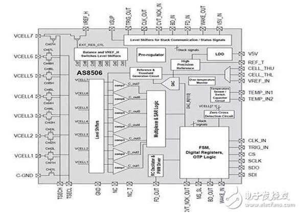 在業(yè)界所研發(fā)的新結(jié)構(gòu)中,BMS采用電池組監(jiān)控器與電池監(jiān)控系統(tǒng)。電池組監(jiān)控器能測(cè)量電池整體的電壓、溫度與電流,是由雙信道傳感器接口及精密分流電阻與精密電池組電壓衰減器實(shí)作而成。