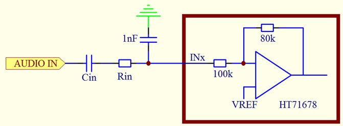 HT71678內(nèi)置100k輸入電阻,80k反饋電阻,這樣芯片內(nèi)部前級(jí)增益為0.8倍;外部輸入電阻Rin和內(nèi)部100k組成系統(tǒng)的輸入電阻;這樣系統(tǒng)增益為80k/(Rin+100k),單位為倍數(shù)。