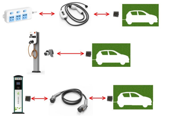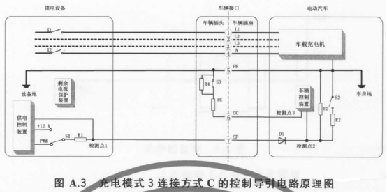 在交流充電中,具體會涉及到下面三種場景,這里只分析充電模式三、連接方式C這種場景(對應(yīng)中間圖片),因為其他兩種場景與其類似。