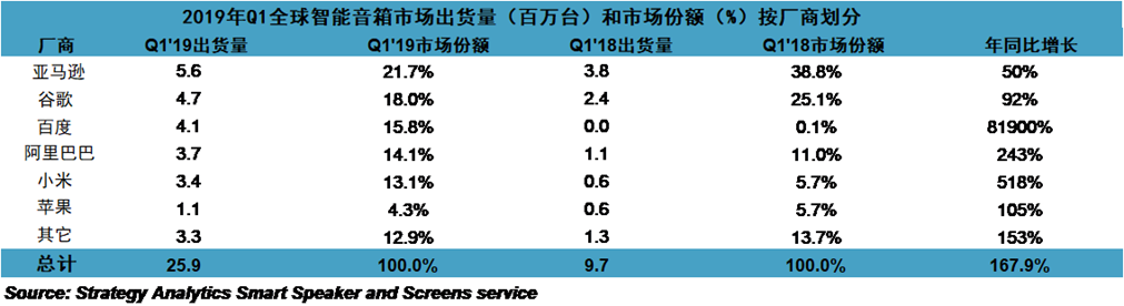 Strategy Analytics最新發(fā)布的研究報(bào)告指出,2019年Q1中國智能音箱的銷量同比增長超過500%。 這推動(dòng)了全球智能音箱Q1的銷量增至2590萬臺(tái),比2018年同比增長168%。盡管亞馬遜和谷歌仍分別位居第一和第二,但中國品牌的全球市場份額已接近亞馬遜和谷歌。 春節(jié)期間的促銷活動(dòng)推動(dòng)了中國的需求增長,而百度的小度在家智能顯示器尤其受歡迎。 Strategy Analytics現(xiàn)已將2019年全年全球出貨量預(yù)測上調(diào)10%至1.477億臺(tái)。