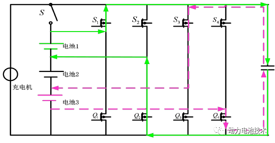 充電過程中,開關(guān)管 S 閉合,充電機(jī)給電池組充電。此時電池組右側(cè)開關(guān)管全部斷開,均衡系統(tǒng)不開啟。設(shè)單體電池B1 電壓開始明顯高于其他電池并達(dá)到均衡閾值時,此時均衡系統(tǒng)開啟,S1、Q2開關(guān)管閉合,電感與單體電池 B1 并聯(lián),起到分流的作用,電感儲存來自充電機(jī)與電池 B1 的能量;當(dāng) S1、Q2 開關(guān)管置 0,Q3、S4 開關(guān)管置 1 時,電感給充電過程的單體電池 B3 釋放一定能量。