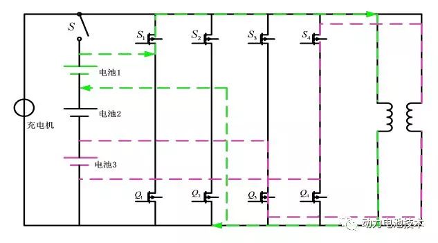 控制原理如下:設(shè)電池組內(nèi) B4 電壓最高,B2 電壓最低,控制繼電器 S5、S3、Q4、Q2 閉合,此時兩節(jié)單體電池并聯(lián),兩單體電池自動均衡,電壓趨于一致。該拓?fù)涞娜秉c(diǎn)是充電過程中不能進(jìn)行均衡,只能靜置去極化時候進(jìn)行并聯(lián)均衡。